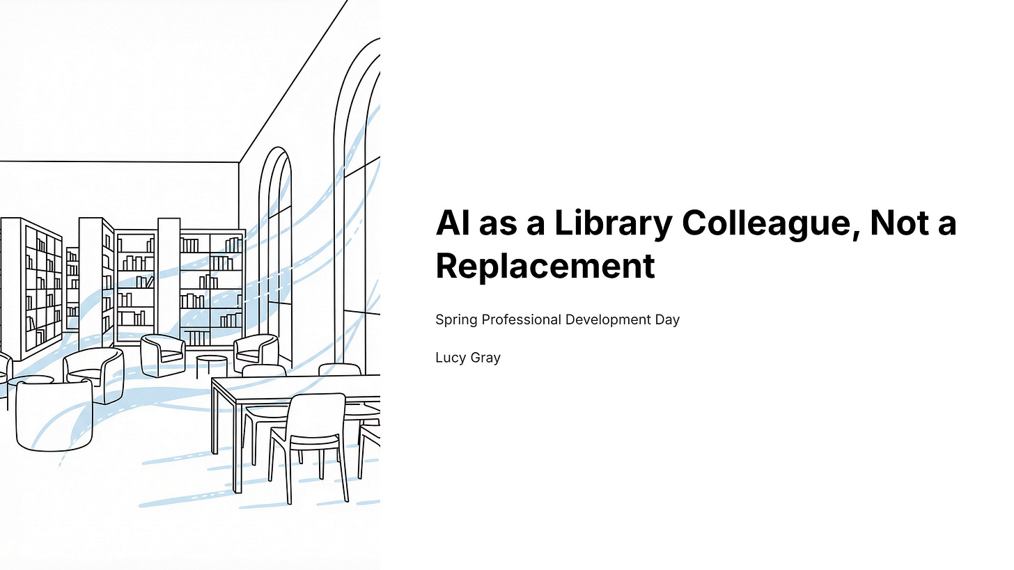 My tentative plan is deliver a customized presentation on getting started with generative AI from a library worker’s perspective and address some of the concerns people might have. I’ve chosen the theme of considering Gemini a colleague, not as a replacement for a librarian or library worker. I’ve drafted a pre-session survey to gauge my colleagues’ interests and concerns and a rough draft of a presentation in Gamma.